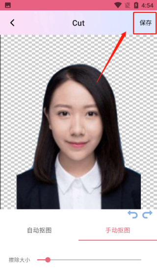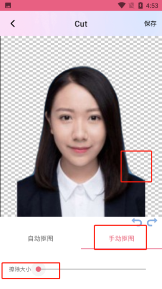 4、一键抠图后可以点击手动抠图,调节擦除的大小,对没抠好地方进行调整