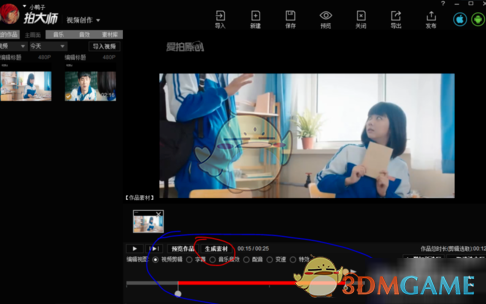 5.可以通过控制下面的进度条来剪辑你想要的片段,剪辑完成后选择生成素材,在左边就会生成你剪辑后的素材。