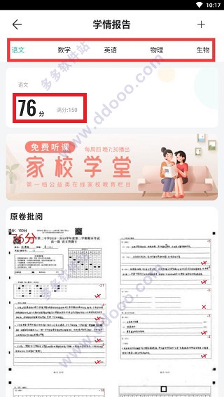 6、点击后可以看到各个学科的成绩、答题卡原卷,想看哪个就看哪个,“哪里不会点哪里”