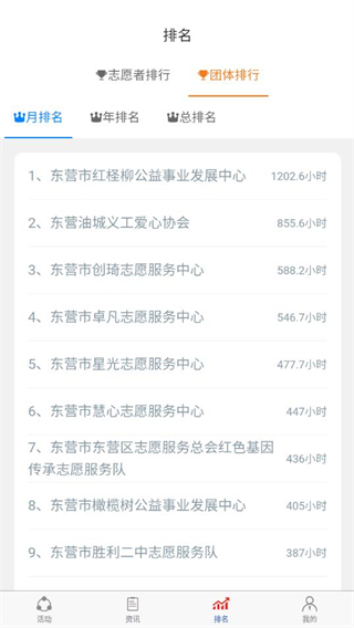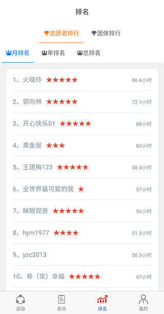 4、【排名】页则是展示了志愿者和团体的月排名、年排名、总排名等情况。