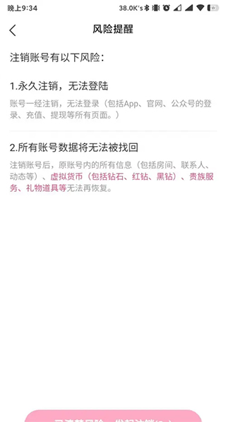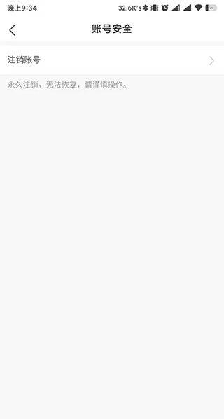 在账号安全界面中找到注销账号选项,点击后进入风险提醒界面。