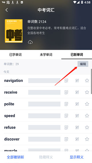 5、在已斩单词里找到要恢复的单词,点击右上方编辑