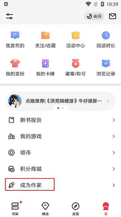 1、首先在手机上打开起点读书app,点击底部我——找到成为作家