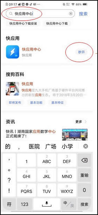 全搜中搜索快应用中心,点击即可打开快应用中心首页。