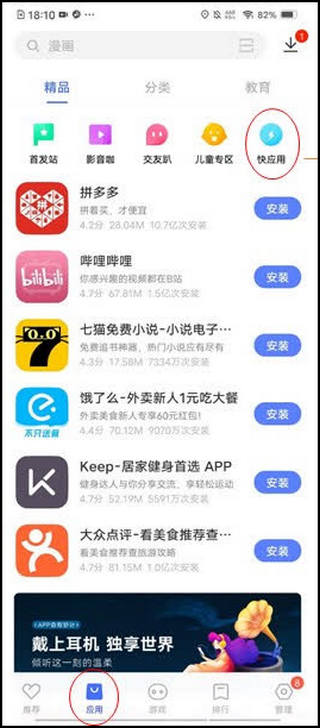 进入应用商店—选择应用—点击右上角快应用,同样可以进入快应用中心首页。