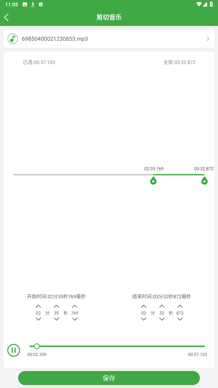 3、滑动中间的进度条可以选择剪切哪一段,下面的开始时间和结束时间可以进行微调时间,剪辑好就可以直接保存了。