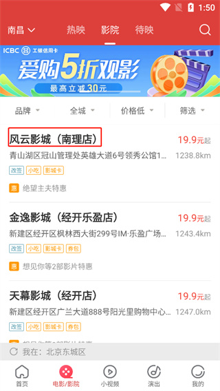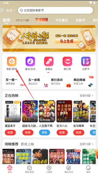 1、打开软件,首页为用户提供了电影/影院、演出、密室、放映厅,剧集等等功能,我们点击电影/影院;