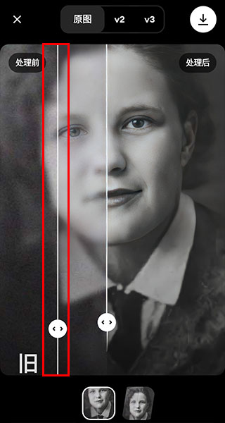 4、处理完成后来到下方界面后拖动中间的指针即可查看处理前后的差别