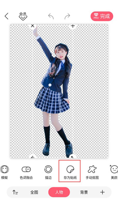 7、除了保存为贴纸之外,我们点击页面右上角的“完成”按钮,可以将透明背景的人物图保存至手机本地。不过保存透明背景需要开通PRO会员才能使用
