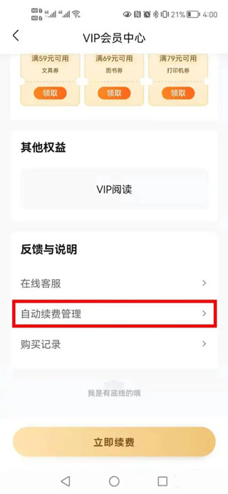 3、将【VIP会员中心】页面的拉到最下面,有个【反馈与说明】,点击下面的【自动续费管理】。