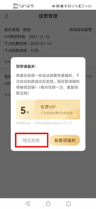6、商家为了防止你取消自动续费,会发些吸引的优惠,不用管它,直接点击【残忍拒绝】就好了。如果下次再需要开通VIP功能,使用时再开就行了,开通后别忘记按以上步骤再把自动续费功能关闭掉。