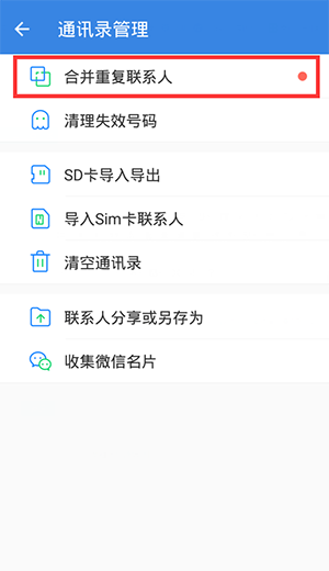 请在右下角【我的】菜单中,找到【通讯录管理】选项,其中就有“合并重复联系人”功能,点击进入后,按照指引操作即可。