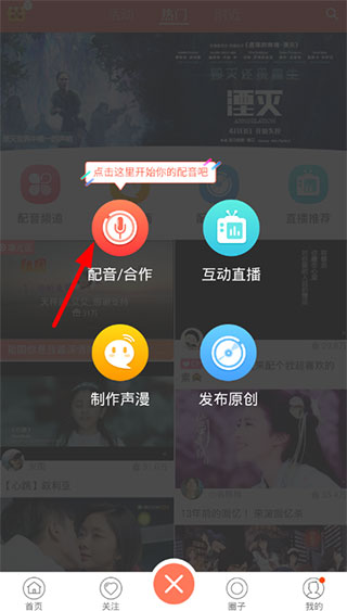 ①如果想要通过配音秀来制作上传自己的素材,那么就需要先点击下方“+”选项,选择功能列表中的“配音/合作”功能,就可以去上传自己的素材了。