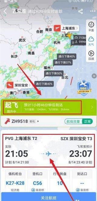 4、点击地图,查看航班飞行过程中的实时动态