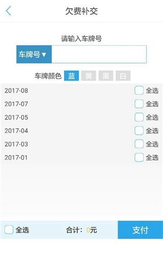 3、若忘记支付停车费,则点击“欠费补交”,输入车牌号后即可查询到车主的所有欠费信息;
