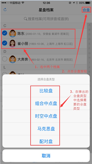 2、或者进入星盘档案页面,选择两个档案,点击右上角的“合盘”按钮,在弹出的合盘类型中选择需要的合盘类型