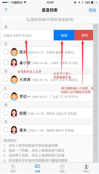 在档案条目上,按住条目往左滑动,即可显示对该条档案的操作菜单,你可以通过菜单对该档案进行编辑和删除操作