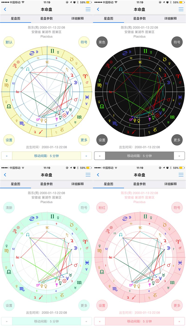 4、多种星盘配色和样式,符号版、文字版、专业版三种模式,组合成128中星盘外观。