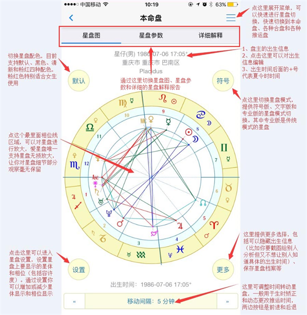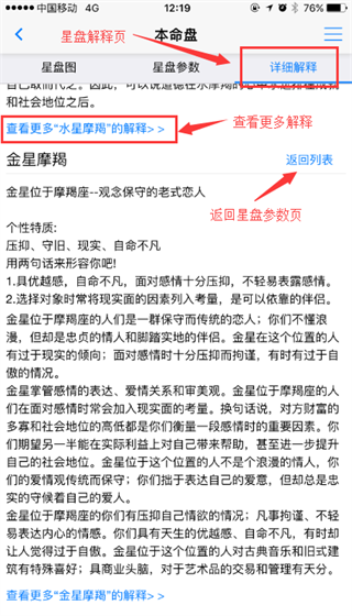 1、通过顶上的Tab选择或者手指左右滑动可以切换星盘图星盘参数列表和详细星盘解释二个内容