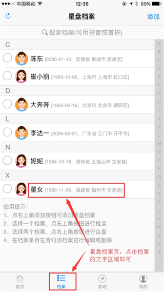 点击app底部导航“档案”即可进入星盘档案管理页面,如果你还没有登录,请先登录