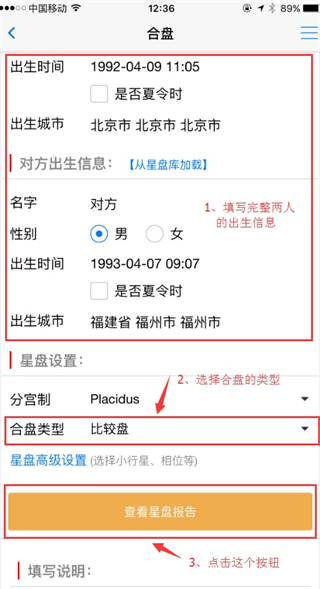 1、进入app“首页”,点击其中的合盘进入,输入需要合盘的两人的出生信息,然后点击“查看星盘报告”