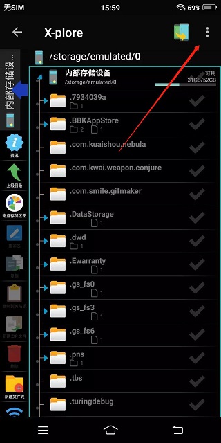 1、打开x-plore文件管理器,点击右上角三个点,