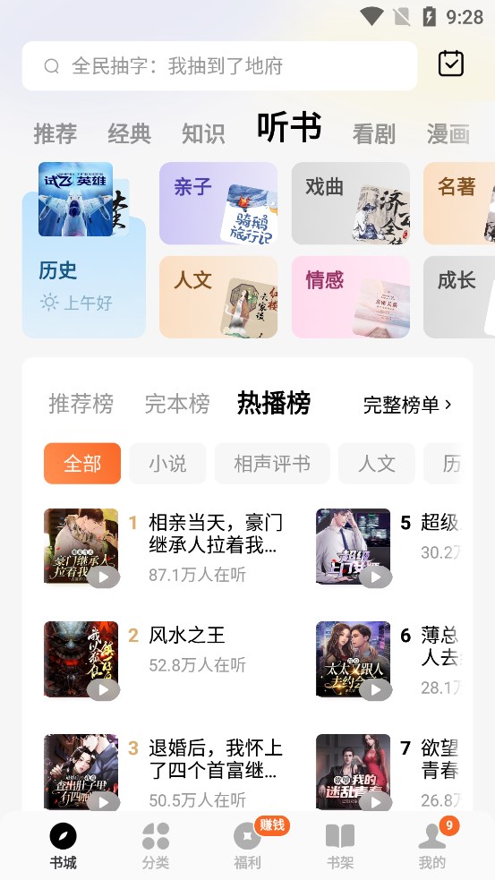 海量小说,全场畅听!都市爽文、悬疑惊悚、言情穿越、玄幻修仙、 武侠江湖......超全分类,你想听的全都有。