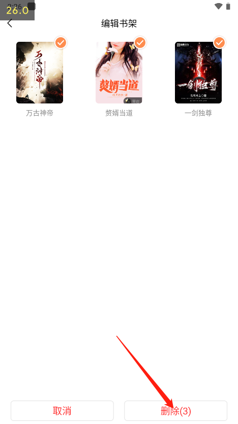 3、然后勾选你的书籍,点击右下方删除的选项,即可将书架中的书籍删除。
