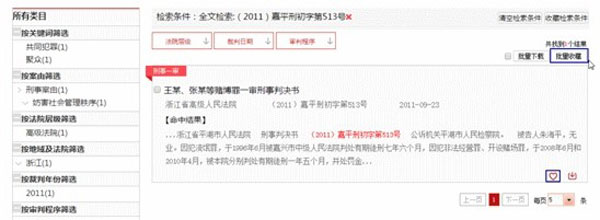 在登录状态下,在列表页中点击“批量收藏”按钮,弹出选择案例包窗口。用户选择或新增案例包,可以将文书收藏至个人中心-我的收藏-案例包。