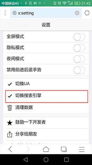 2、X浏览器默认的搜索引擎是“百度" ,不过我们可以到设置中把默认搜索改为Google 或DuckDuckGo 。从主菜单进入设置界面你可以看到切换搜索引擎的选项。