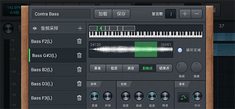 ②最上方一栏显示当前音色名称,加载和保存音色。对于复音数:如果你需要乐器同时播放几个音,比如钢琴和弦,那么需要加大复音数。但是复音数过高会加大CPU的负荷产生卡顿,所以需要针对设备的具体情况进行调整。