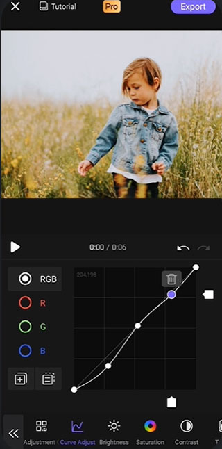 视频调色功能包括“亮度”、“饱和度”、“对比度”、“色温”、“色调”、“锐化”、“漏光”、“高光”、“阴影”、“粒子”、“渐晕” "; 还包括更强大的“曲线色调”;并支持RGB通道独立调节,让用户可以自由调节视频画面的色彩,营造耳目一新的视觉效果。