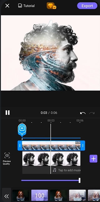 VivaCut可用于叠加两段视频或图片,包括“滤色”、“正片叠加”、“柔光”、“多次”等十余种混合模式,打造“双重曝光”的无缝艺术效果”。