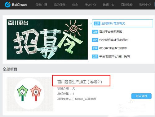 2、接下来,查看“任务广场”已提供的任务。比如“百川题目加工生产”,这个项目主要是对各种学科的重新排版,包括题目和答案的重新排版。
