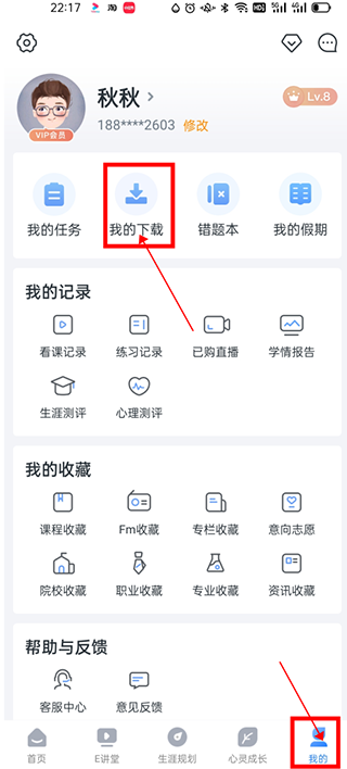 E讲堂下载的视频和心灵成长下载的FM,在右下角点击我的-我的下载里面进去查看就可以哦