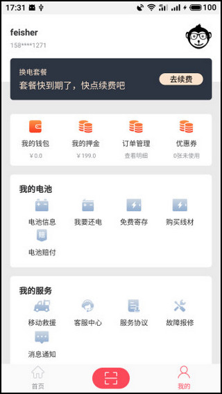 1、在“我的”页面中点击“退电池”按钮,然后确认退电池。