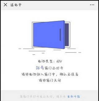 2、然后扫码换点柜,将电池放入弹出的空箱中,待完成即可完成退电池。