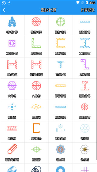 2、我们进入到型材计算功能里面,里面又包含了很多的计算模式,都能够很精确的帮助您计量,转换数据。接下来可以随便进入一个计算类型,小编为您演示的是特材计算。