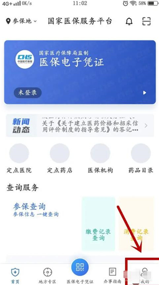 进入到国家医保服务平台首页,点击右下角的【我的】。