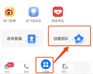 1、打开软件后点击“工作台”,下拉到页面底部点击“创建团队”。