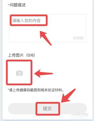 4、然后填写问题描述和上传相关证明,点击【提交】等待审核完成即可恢复健康码状态。
