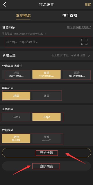 3、设置推流地址,在根据自己实际情况来配置参数(直播分辨率、屏幕分享、直播帧率、传输模式)