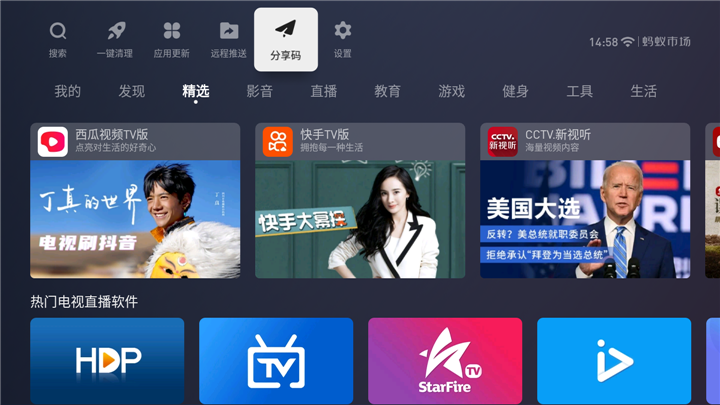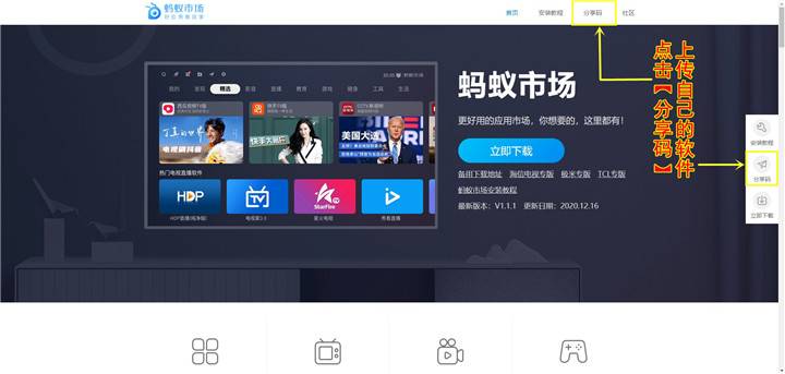 1.在电视上安装蚂蚁市场(各机型安装教程可以在官网社区查看)打开蚂蚁市场,找到分享码页面。