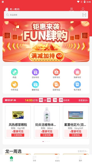 1、进入软件,首先引入眼帘的便是首页,在这里你可以通过上方的药品搜索栏进行药品搜索,也可以点击下面的板块进行详细了解,如药品、活动专区、诊所专区、免邮专区、中药专区、器械专区、控销专区…