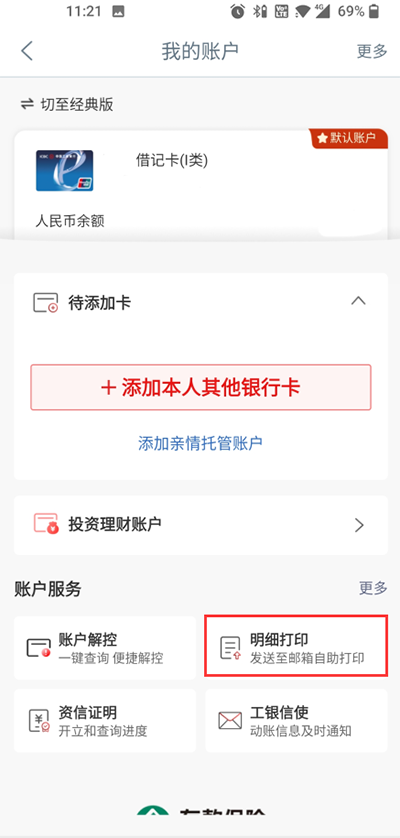 2、在我们的账号里可以看到自己的银行卡信息,选择底下“账户服务”里的明细打印。