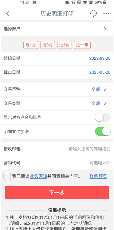 3、最后只需要填写自己想要导出的流水时间等信息,就可以在自己邮箱里收到一份电子稿的工商银行手机银行流水情况。