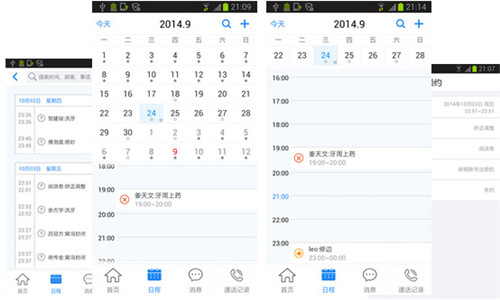 日程界面显示医生的预约和排班信息,当预约个数较少时用圆圈标记,较多时用黑点标记。选中某天时下面列表会列出当天的预约。在日历界面向上滑动时会将月日历变成周日历。点击搜索按钮可以进入当月日历的列表模式,可以根据时间、顾客名和预约事项进行搜索。点击预约条目可打开预约的详细信息。