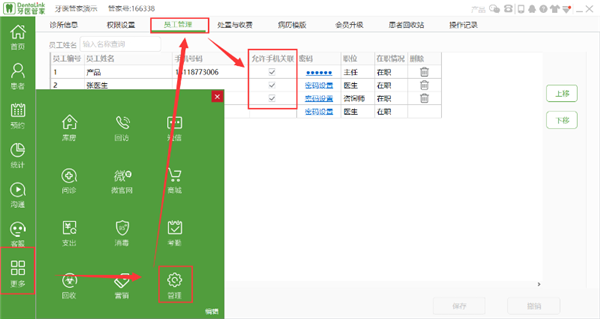 1、下载好手机端牙医管家并注册账号之后,需确认是否有关联手机的权限(点击更多---管理---员工管理---允许手机关联)。如没有勾选该选项,则账号无法关联手机端。