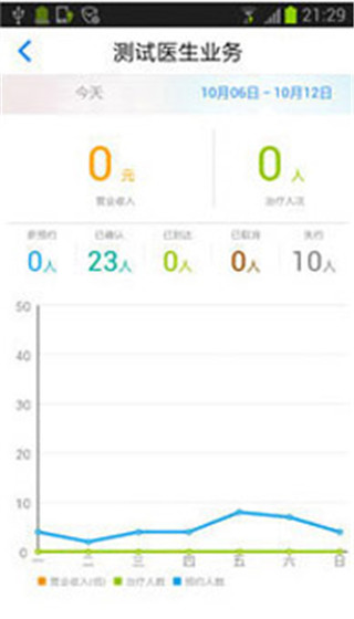 业务信息可按天和周统计营业收入、治疗人次和预约人次,周列表可描绘出趋势。