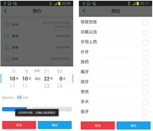 医生可在预约界面直接选择时间,事项和顾客进行预约,当时间安排有冲突时系统会自动进行提示。